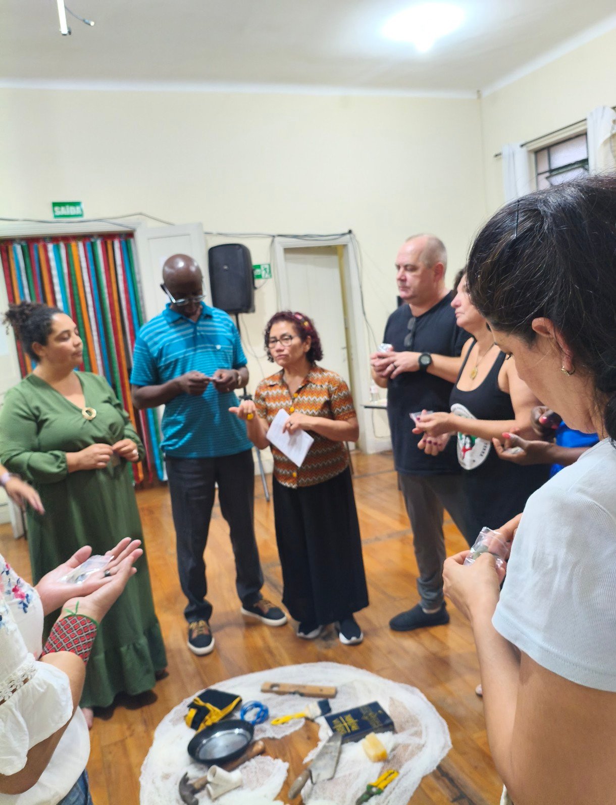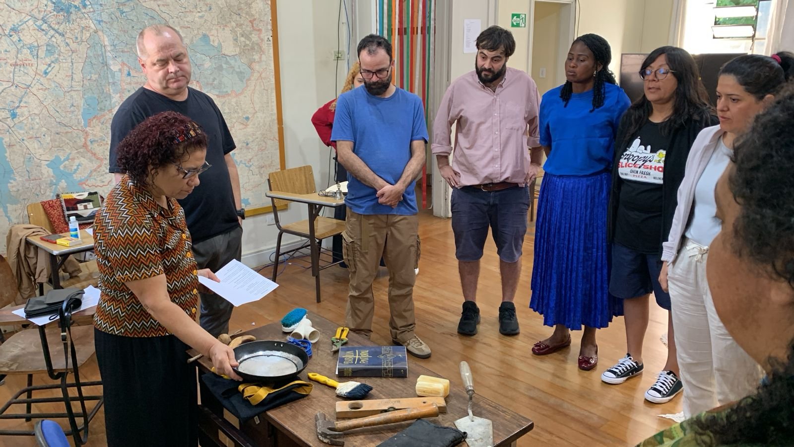 A abertura foi conduzida por Maria Maranhão, que utilizou uma diversidade de objetos simbólicos do trabalho, incluindo uma frigideira, sabão, martelo, avental, pincel, caneta, nivelador, colher de pedreiro, tesoura de jardim, Bíblia, escova e um cabo de internet. A dinâmica permitiu que cada participante escolhesse um item para o centro da mística, compartilhando em seguida a história pessoal vinculada à ferramenta selecionada.