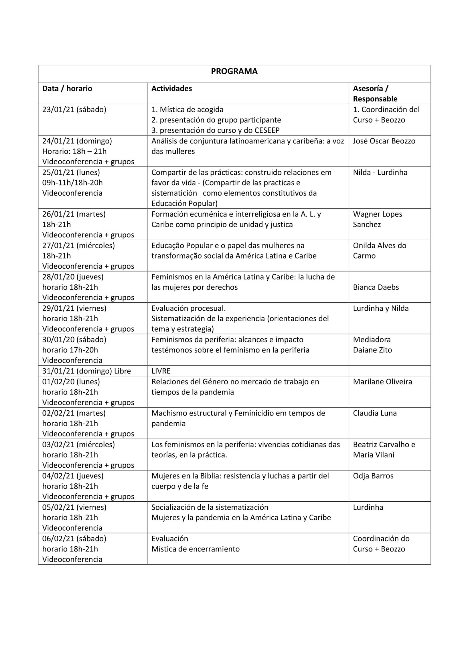 El curso de Pastoral y Relaciones de Género, en su edición 2021, extraordinariamente será realizado con formato . Como medida de seguridad y protección de la salud y delante de los riesgos por el contagio de la pandemia – COVID-19, nos responsabilizamos por el desafío de organizar un curso que mantuviera la mayoría de las características de los cursos ofrecidos por el CESEEP con formato presencial. Entre estas características está la metodología de la Educación Popular, de la cual destacamos algunos constitutivos, como compartir las prácticas, profundizar los contenidos y la sistematización.